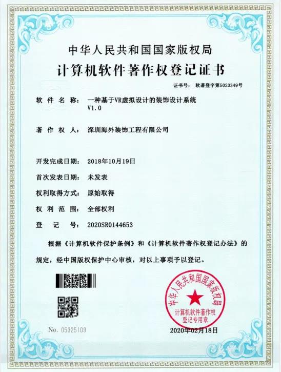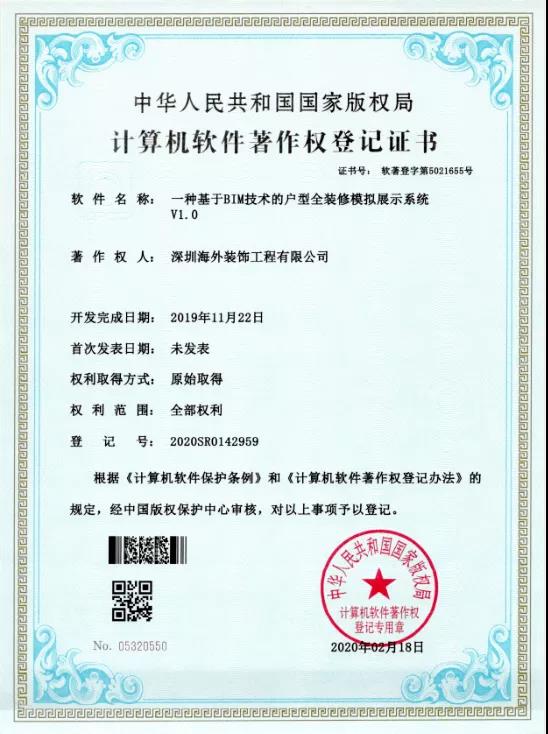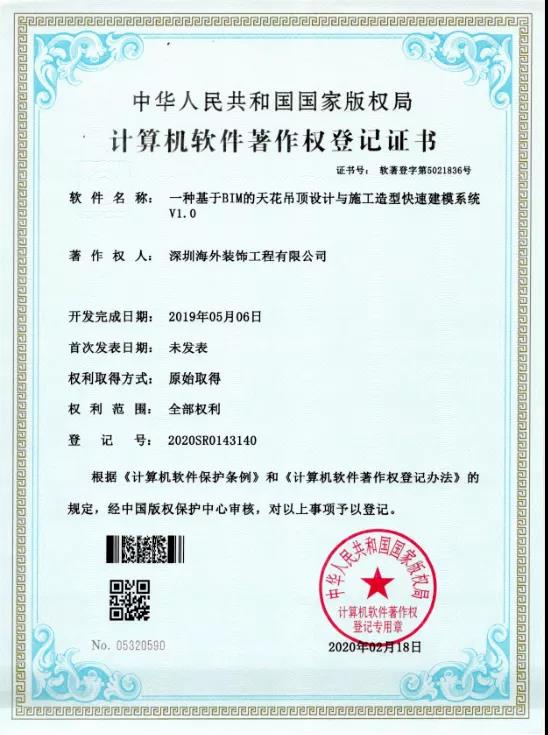 近日,繼獲得兩項國家實用新型專利后,深圳海外裝飾工程有限公司(以下稱“海外裝飾”)工藝工法建設工作再獲佳績,榮獲五項計算機軟件著作權(quán) :“一種基于VR虛擬設計的裝飾設計系統(tǒng)V1.0”、“一種基于計算機開發(fā)的智能裝飾設計系統(tǒng)V1.0”、“一種室內(nèi)設計測繪裝置及在線輔助系統(tǒng)V1.0”、“一種基于BIM技術(shù)的戶型全裝修模擬展示系統(tǒng)V1.0”、“一種基于BIM的天花吊頂設計與施工造型快速建模系統(tǒng)V1.0”。 至此,海外裝飾已擁有11項軟件著作權(quán)。