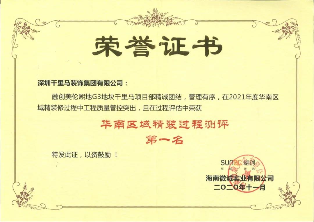 近日,千里馬裝飾位于海南省澄邁縣老城軟件園區(qū)的融創(chuàng)美倫熙語(yǔ)G3地塊15#、16#、20#樓項(xiàng)目憑借專業(yè)的施工、科學(xué)的管理,最終榮獲“2021年度融創(chuàng)集團(tuán)精裝過(guò)程測(cè)評(píng)華南區(qū)域第一名”的優(yōu)異成績(jī)。