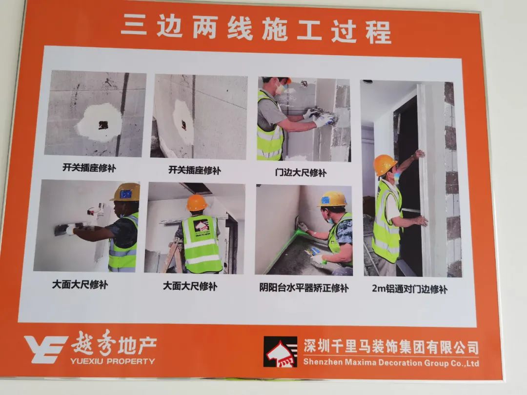 該項目重難點主要體現在以下幾個方面:1、衛生間和陽臺地面瓷磚采用濕貼鋪法,能有效地防止滲漏隱患,項目部針對瓷磚濕貼對工人進行了專門的技術交底,嚴格按照工序與質量要求進行施工。2、三邊兩線工藝,在涂料施工前嚴格按照三邊兩線工藝,門窗邊、柜體邊、開關面板線盒邊、門套線、踢腳線先進行膩子找平施工完成驗收后再開始大面膩子施工;按照甲方高標準要求,本項目開關面板及門套線在乳膠漆完成面漆后再安裝,保留自然縫,呈現較好的觀感質量。3、空調風口百葉采用細邊框,項目部與甲方進行技術溝通,優化了空調百葉的安裝方式,視覺上隱藏了螺絲,大大提升了觀感質量,最終得到越秀地產集團的一致好評和認可。