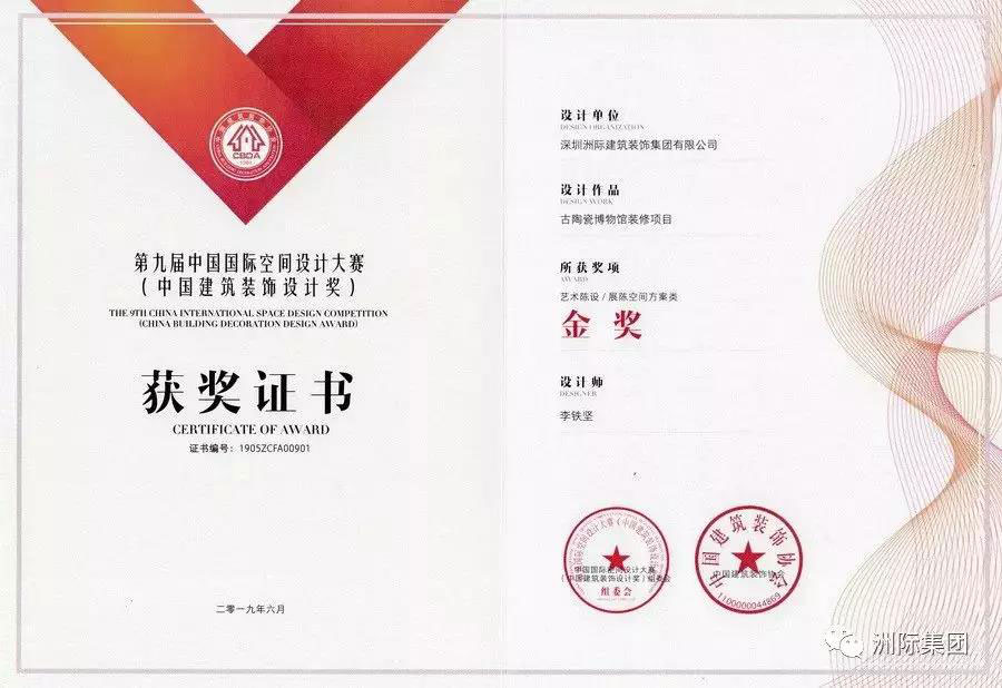 深圳洲際建筑裝飾集團有限公司(以下稱洲際裝飾集團)選送的多項優秀設計作品憑借出色且富有創意的設計在此次行業賽事的激烈角逐中脫穎而出,斬獲多個重量級設計類獎項:深圳龍崗古陶瓷博物館裝飾裝修設計榮獲“中國建筑裝飾設計獎藝術陳設?展陳空間方案類金獎”;呼倫貝爾大劇院改造工程設計榮獲“中國建筑裝飾設計獎文化?教育空間工程類銀獎”;同時,在機構類獎項的評比當中,洲際裝飾集團被評為“2018年度中國建筑裝飾杰出公共空間設計機構”。