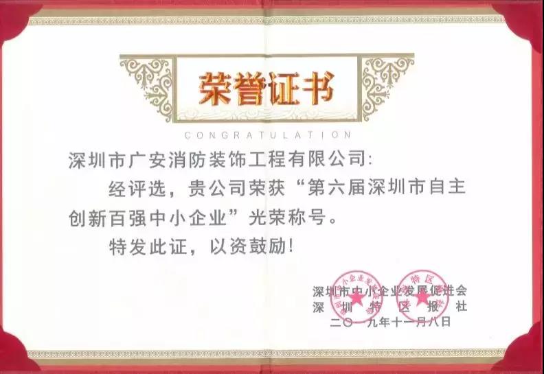 11月8日下午,以“榮耀歲月·攜手共進”為主題的深圳市中小企業發展促進會20周年慶典大會暨第六屆深圳市自主創新百強中小企業頒獎儀式順利舉行。大會上公布了第六屆深圳市自主創新百強中小企業名單,深圳市廣安消防裝飾工程有限公司(以下稱“廣安消防”)成功入圍,位列第18名。