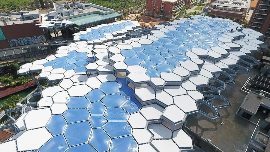 《超高大樹狀自膨脹ETFE天幕膜結構施工工法》是通過研發并應用“天幕膜夾膜水槽集成結構技術”、“自膨脹ETFE天幕膜材技術”和“超高大樹狀鋼支撐桿技術”,結合BIM技術模擬施工現場,達到精準生產加工、精準施工安裝的科技成果。此工法可在不增加成本、保證膜結構工程質量的情況下,有效地縮短工期、節能減耗、優化工藝流程和施工技術,提高ETFE天幕膜結構安裝的施工效率,解決施工中的碰撞沖突問題。
