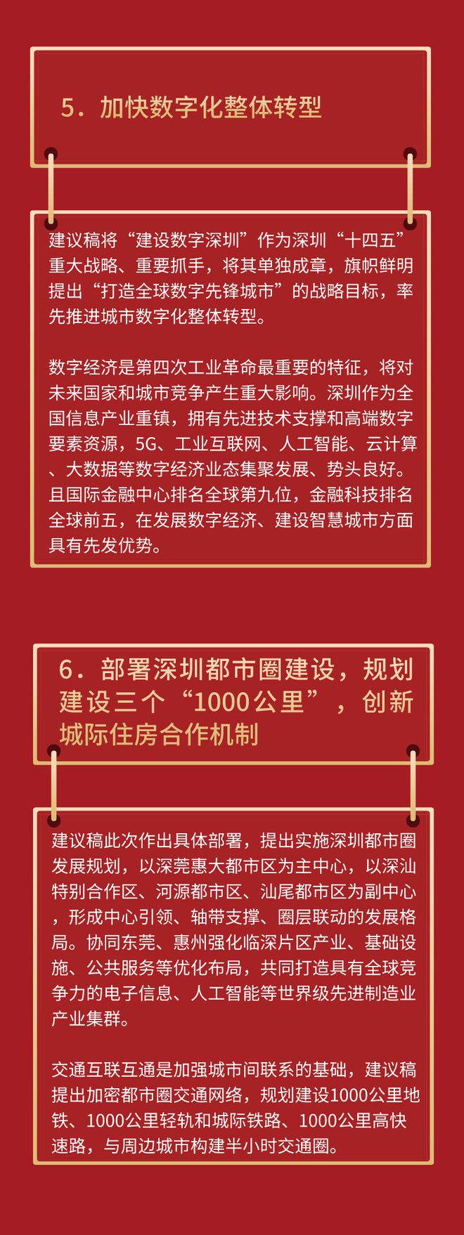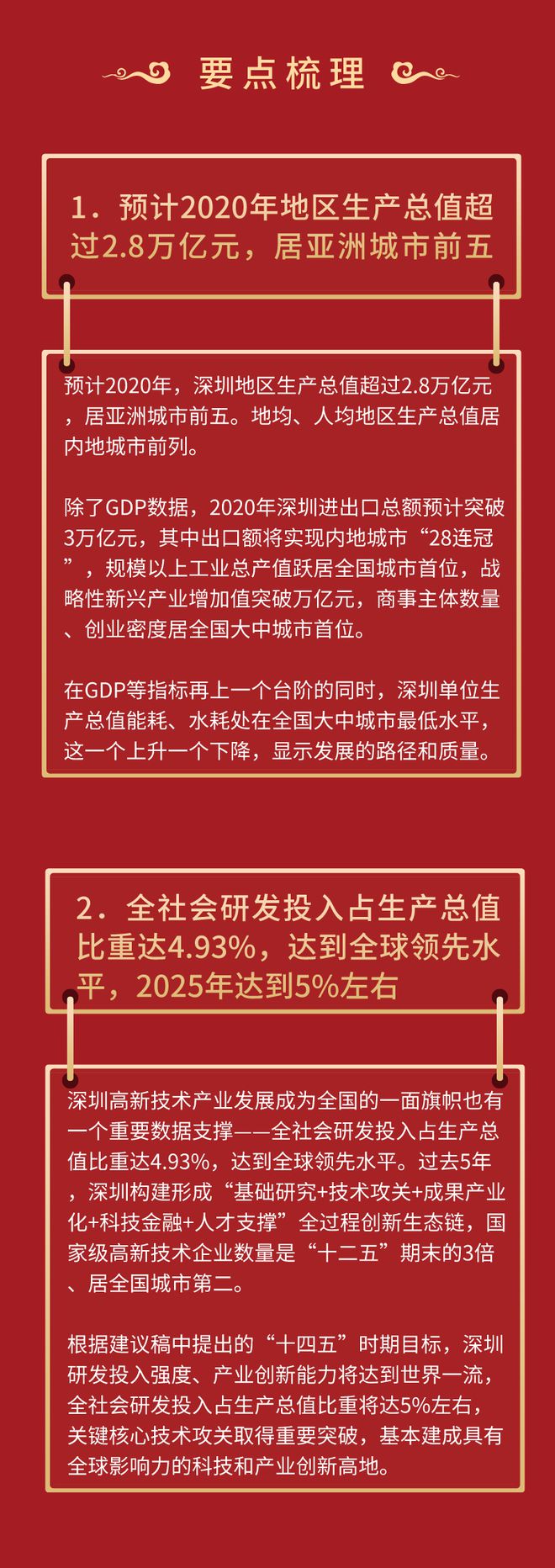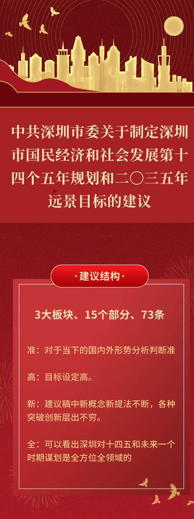 近日,《中共深圳市委關(guān)于制定深圳市國民經(jīng)濟和社會發(fā)展第十四個五年規(guī)劃和二〇三五年遠景目標(biāo)的建議》(以下簡稱“建議稿”)正式出爐,建議稿在結(jié)構(gòu)上分3大板塊,共15個部分、73條,約2.7萬字,詳細闡述了深圳今后5年、10年乃至15年的經(jīng)濟社會發(fā)展,信息量極大。