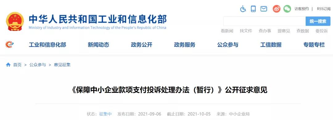 為進一步貫徹落實《中小企業促進法》和《保障中小企業款項支付條例》要求,切實保障中小企業合法權益,工業和信息化部中小企業局組織起草《保障中小企業款項支付投訴處理辦法(暫行)》(征求意見稿),公開征求社會各界意見,意見征求截止日期為2021年10月5日。