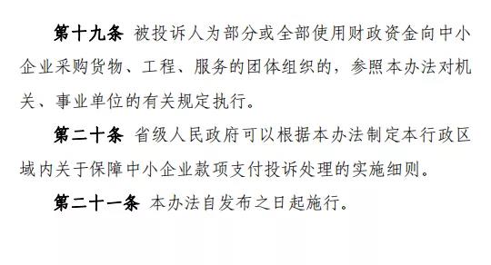中小企業就機關、事業單位和大型企業違反合同約定拒絕或者遲延支付貨物、工程、服務款項提起投訴,省級以上人民政府負責中小企業促進工作綜合管理的部門受理投訴,有關部門、地方人民政府對投訴做出處理,適用本辦法。