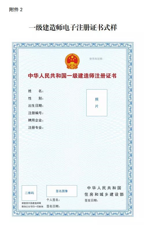 1.自2021年10月15日起,在全國范圍內實行一級建造師電子證書(具體示例及說明見附件1),電子證書式樣按照《全國一體化在線政務服務平臺電子證照一級建造師注冊證書》標準執行(具體式樣見附件2)。自2022年1月1日起,一級建造師統一使用電子證書,紙質注冊證書作廢。
