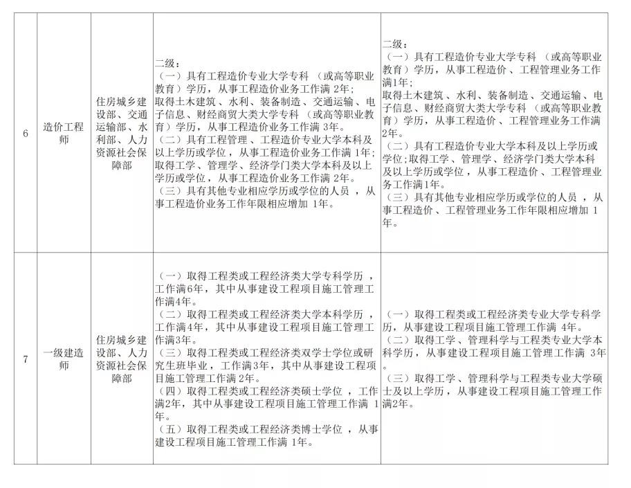 (二)具有通過工程教育專業評估(認證)的工程管理、工程造價專業大學本科學歷或學位,從事工程造價業務工作滿4年;具有工學類、管理學類、經濟學門類大學本科學歷或學位,從事工程造價業務工作滿5年。