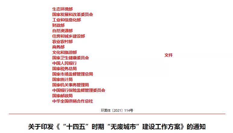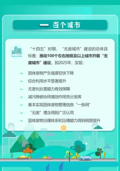 近日,生態(tài)環(huán)境部等18部委印發(fā)《“十四五”時期“無廢城市”建設工作方案》提出,推動100個左右地級及以上城市開展“無廢城市”建設,到2025年,“無廢城市”固體廢物產(chǎn)生強度較快下降,綜合利用水平顯著提升,無害化處置能力有效保障,減污降碳協(xié)同增效作用充分發(fā)揮,基本實現(xiàn)固體廢物管理信息“一張網(wǎng)”,“無廢”理念得到廣泛認同,固體廢物治理體系和治理能力得到明顯提升。