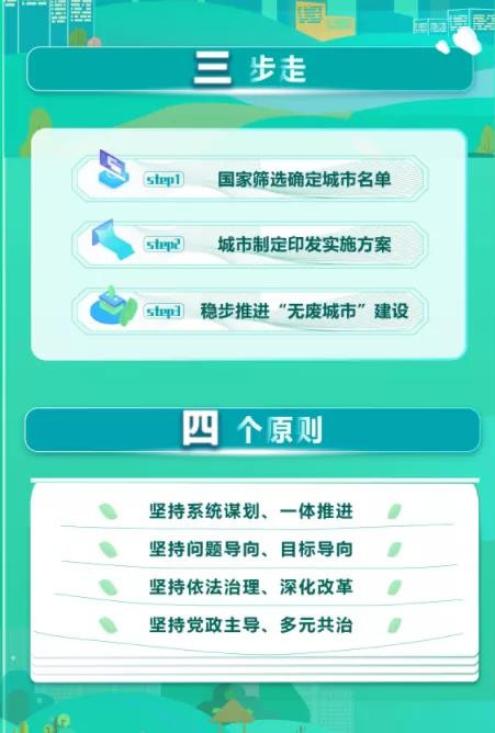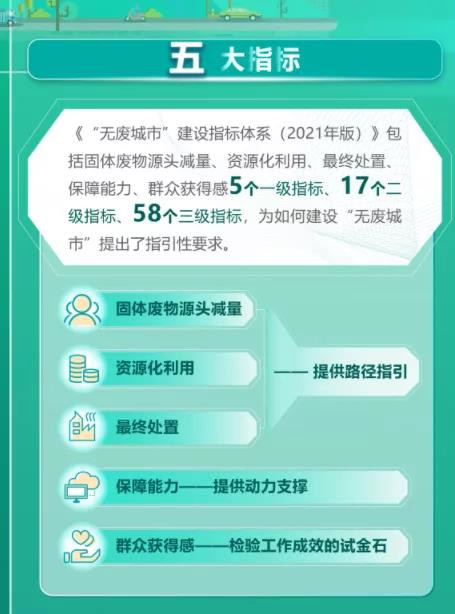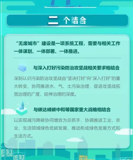 其中要求,科學編制實施方案,強化頂層設計引領。將“無廢城市”建設目標任務納入城市或區(qū)域國民經(jīng)濟和社會發(fā)展“十四五”規(guī)劃及生態(tài)環(huán)境保護規(guī)劃等相關專項規(guī)劃。因地制宜編制“無廢城市”建設實施方案,與深入打好污染防治攻堅戰(zhàn)相關要求、碳達峰碳中和等國家重大戰(zhàn)略以及城市建設管理有機融合,明確任務措施,一體謀劃、一體部署、一體推進。建立完善“無廢城市”建設評估機制,推動將建設成效納入當?shù)攸h委、政府績效考核。同時,統(tǒng)籌市域范圍內(nèi)固體廢物利用處置設施布局,鼓勵跨區(qū)域合作,加強設施共建共享。將生活垃圾、市政污泥、建筑垃圾、再生資源、工業(yè)固體廢物、農(nóng)業(yè)固體廢物、危險廢物、醫(yī)療廢物等固體廢物分類收集及無害化處置設施納入環(huán)境基礎設施和公共設施范圍,保障設施用地和資金投入。構建集污水、垃圾、固體廢物、危險廢物、醫(yī)療廢物處理處置設施和監(jiān)測監(jiān)管能力于一體的環(huán)境基礎設施體系,形成由城市向建制鎮(zhèn)和鄉(xiāng)村延伸覆蓋的環(huán)境基礎設施網(wǎng)絡。