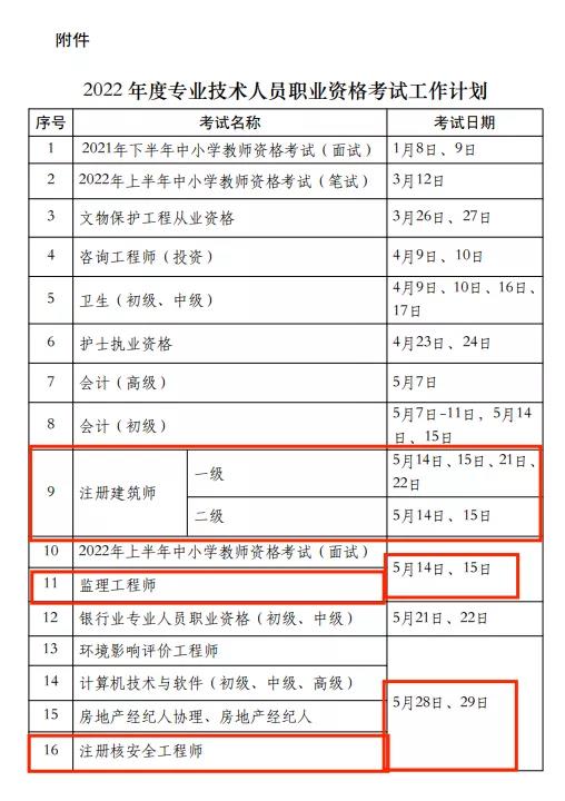 近日,人力資源社會保障部辦公廳公布了2022年度專業技術人員職業資格考試工作計劃,其中對工程行業影響較大的是一級建造師由以前的9月中旬考試調整為11月中旬考試,比以前延后2個月。
