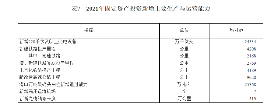 一、基礎設施建設成效明顯。交通網絡更加完善。2021年新建高速鐵路投產里程、新改建高速公路里程分別達2168公里、9028公里。電力生產能力提升。2021年末全國發電裝機容量達23.8億千瓦,比上年末增長7.9%。信息通信網絡不斷加強,服務能力穩步提升。2021年末全國移動電話基站數996萬個,其中5G基站達143萬個;蜂窩物聯網終端用戶13.99億戶,比上年末增加2.64億戶;全年移動互聯網用戶接入流量2216億GB,比上年增長33.9%。