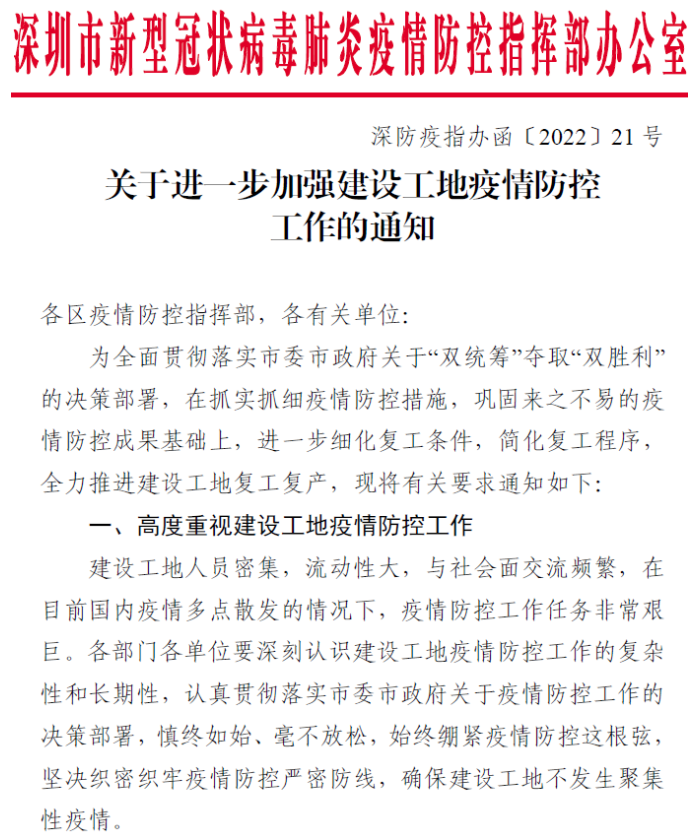 近日,深圳市發布了關于進一步加強建設工地疫情防控工作的通知。