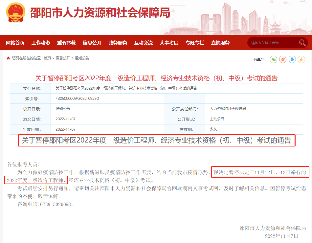 11月7日,湖南通知:我省2022年度經(jīng)濟(jì)專(zhuān)業(yè)技術(shù)資格、一級(jí)造價(jià)工程師考試準(zhǔn)考證暫緩打印。