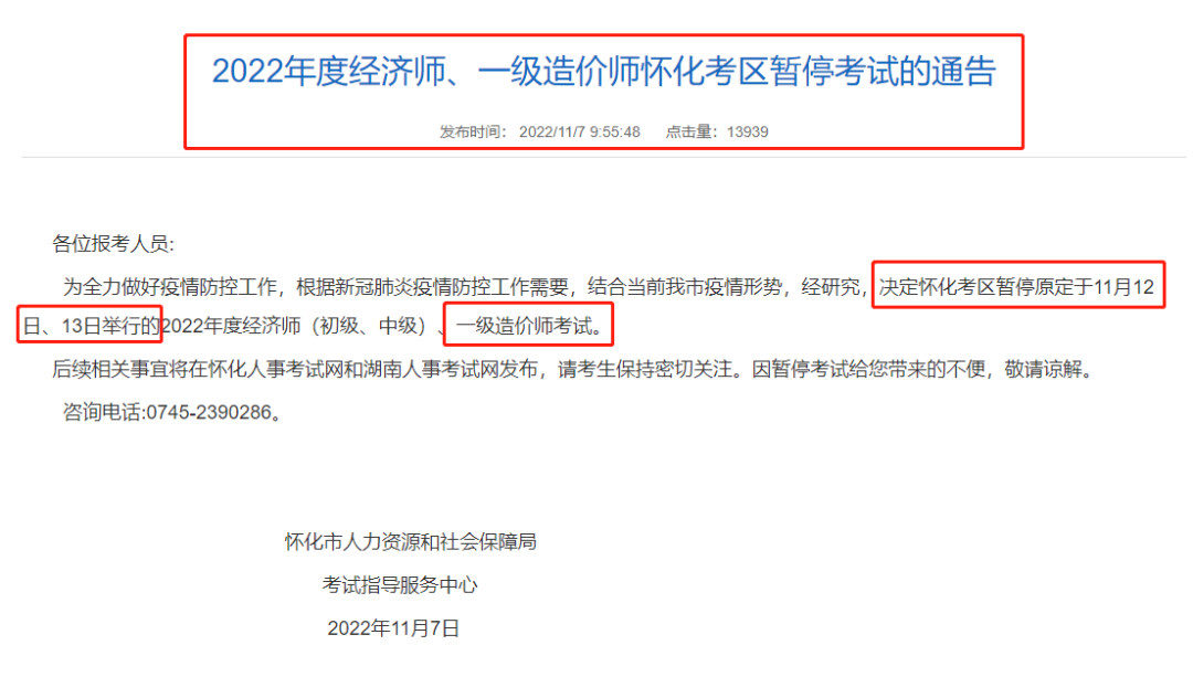 11月7日,湖南懷化和邵陽(yáng)通知:暫停原定于11月12日、13日舉行的一級(jí)造價(jià)師考試。
