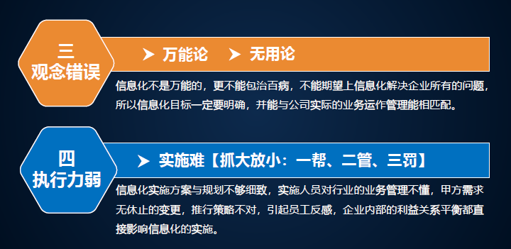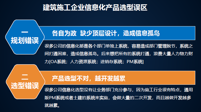 建筑施工企業(yè)信息化產品選型誤區(qū)。很多企業(yè)信息化又想做又害怕,我們總結了幾方面的問題,規(guī)劃錯誤,缺少頂層設計造成信息孤島。每一個部門買自己的。我們了解過一個企業(yè)有八套系統(tǒng),都是獨立的,最后作為領導什么數(shù)據(jù)看的都是不一樣的。產品先型不對,越開發(fā)越累,要懂行的才能研究出來,如果找一個軟件,他什么都不懂,能給你研發(fā)出相關行業(yè)軟件嗎?不行,要選對。萬能論、無用論,軟件不是萬能的,也不是無用的,關鍵是怎么用。能實施好才是最主要的。對于信息化,不管花幾十萬、幾百萬、幾千萬,要落地,否則就打水漂了。信息化是請老師還是請學生?